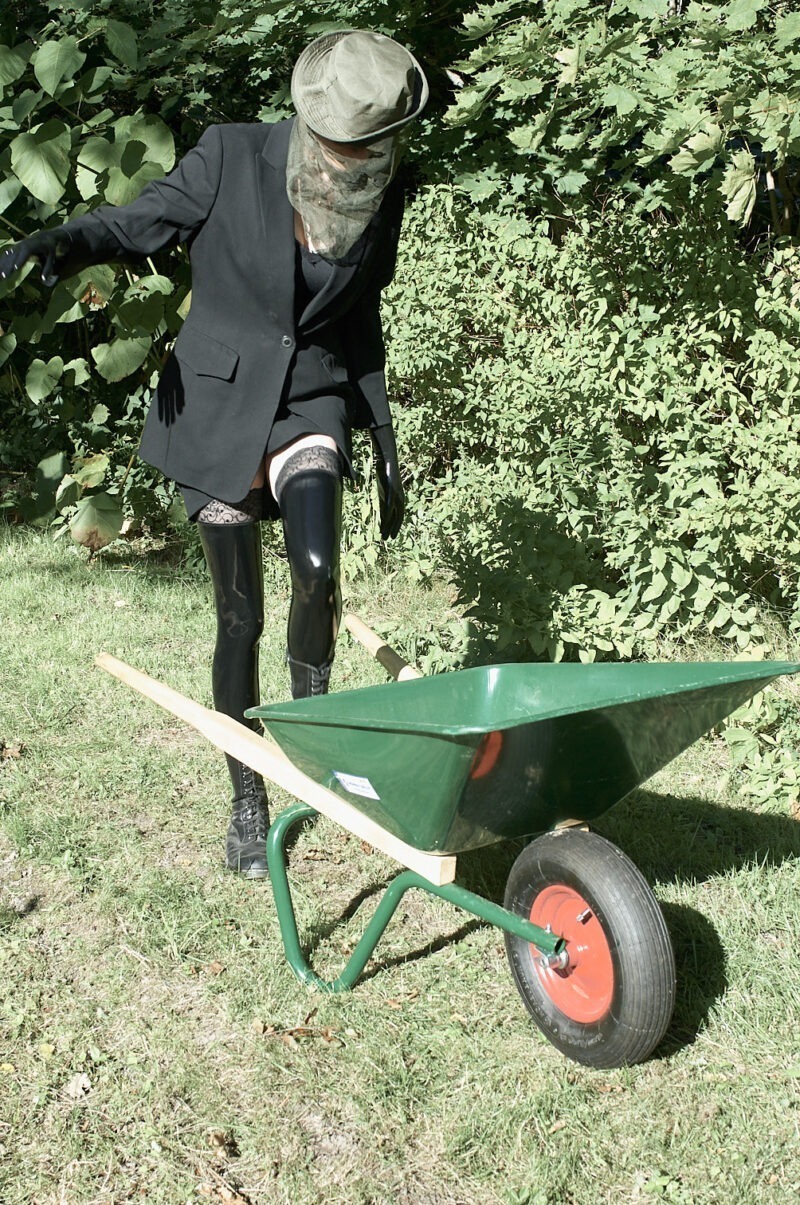 Ein Modell in 0,2 mm Latexstrümpfen und langen 0,2mm Latexhandschuhe. Im Vordergrund ist eine Schubkarre zu sehen